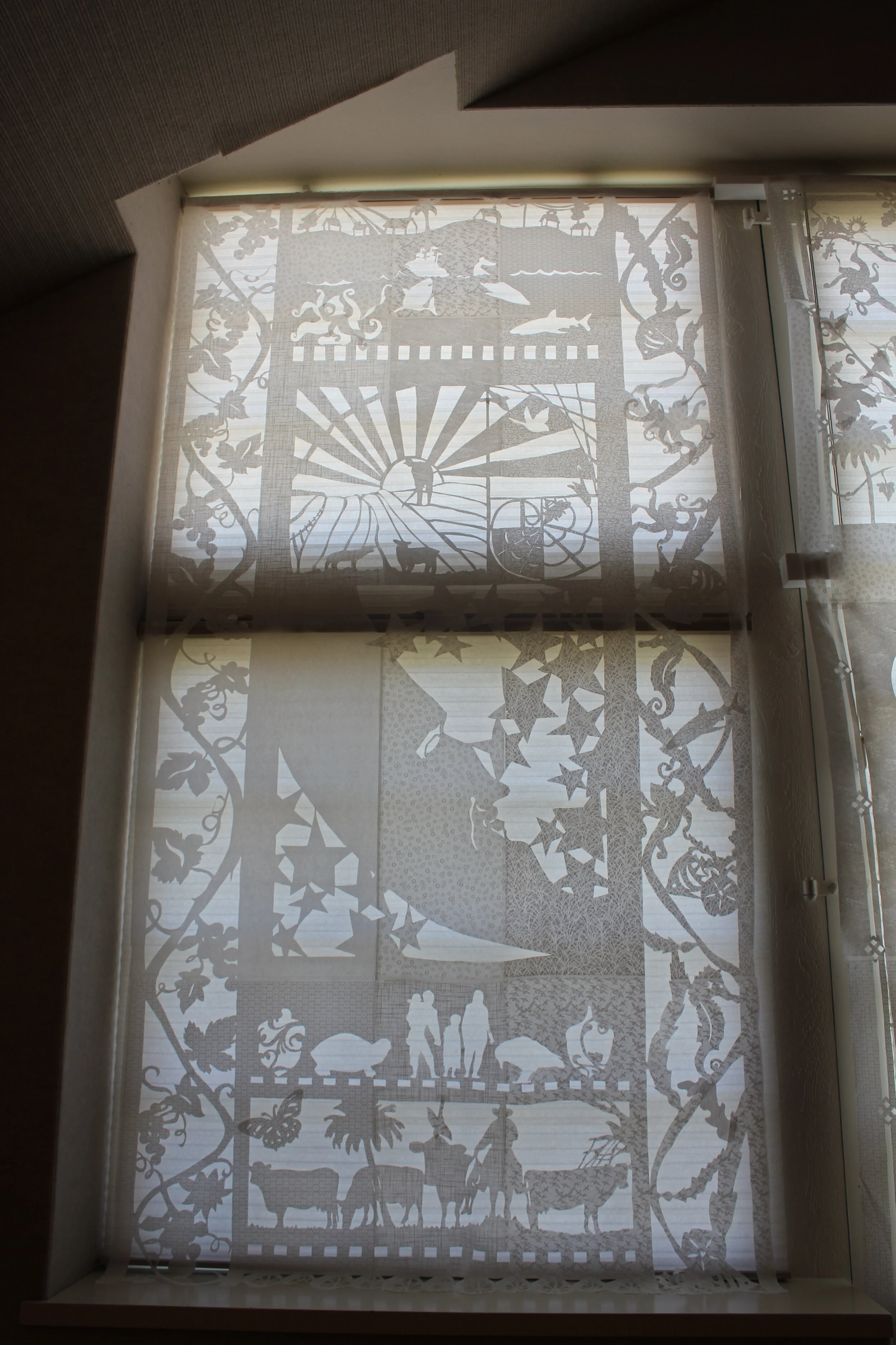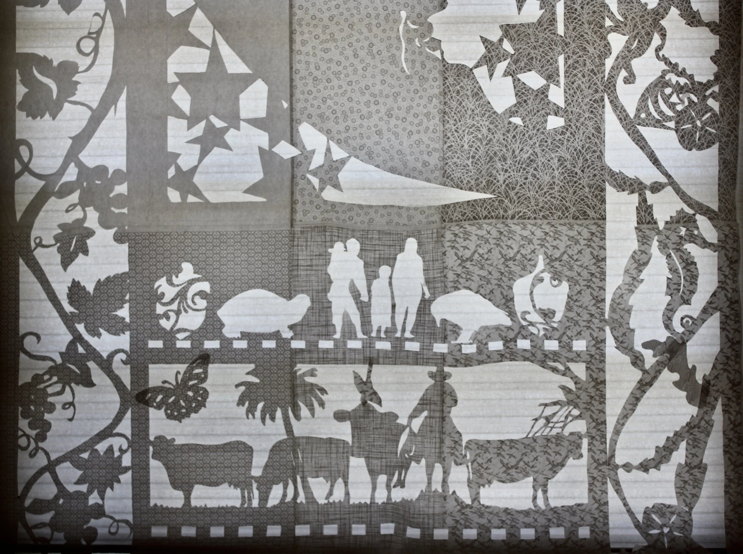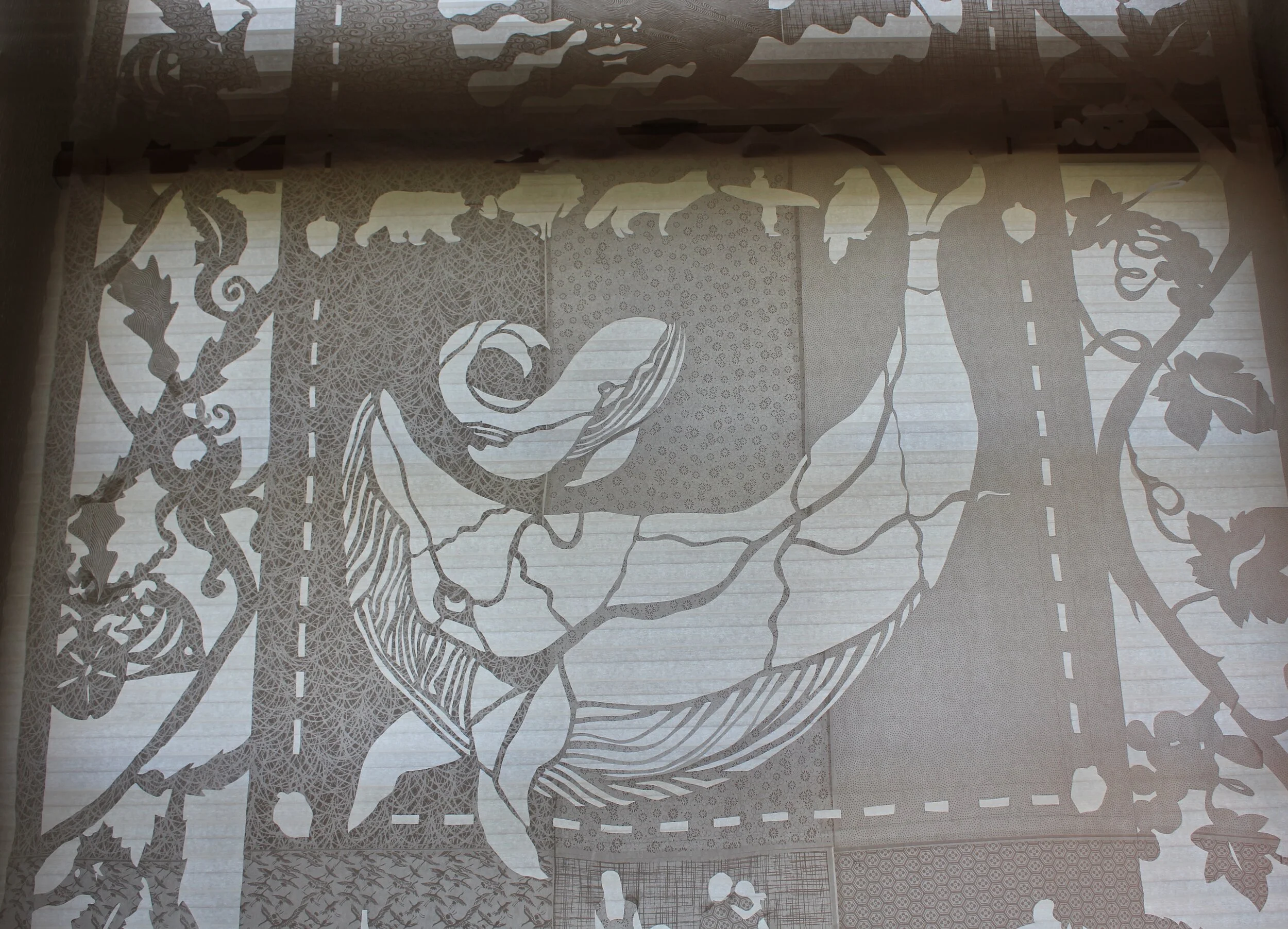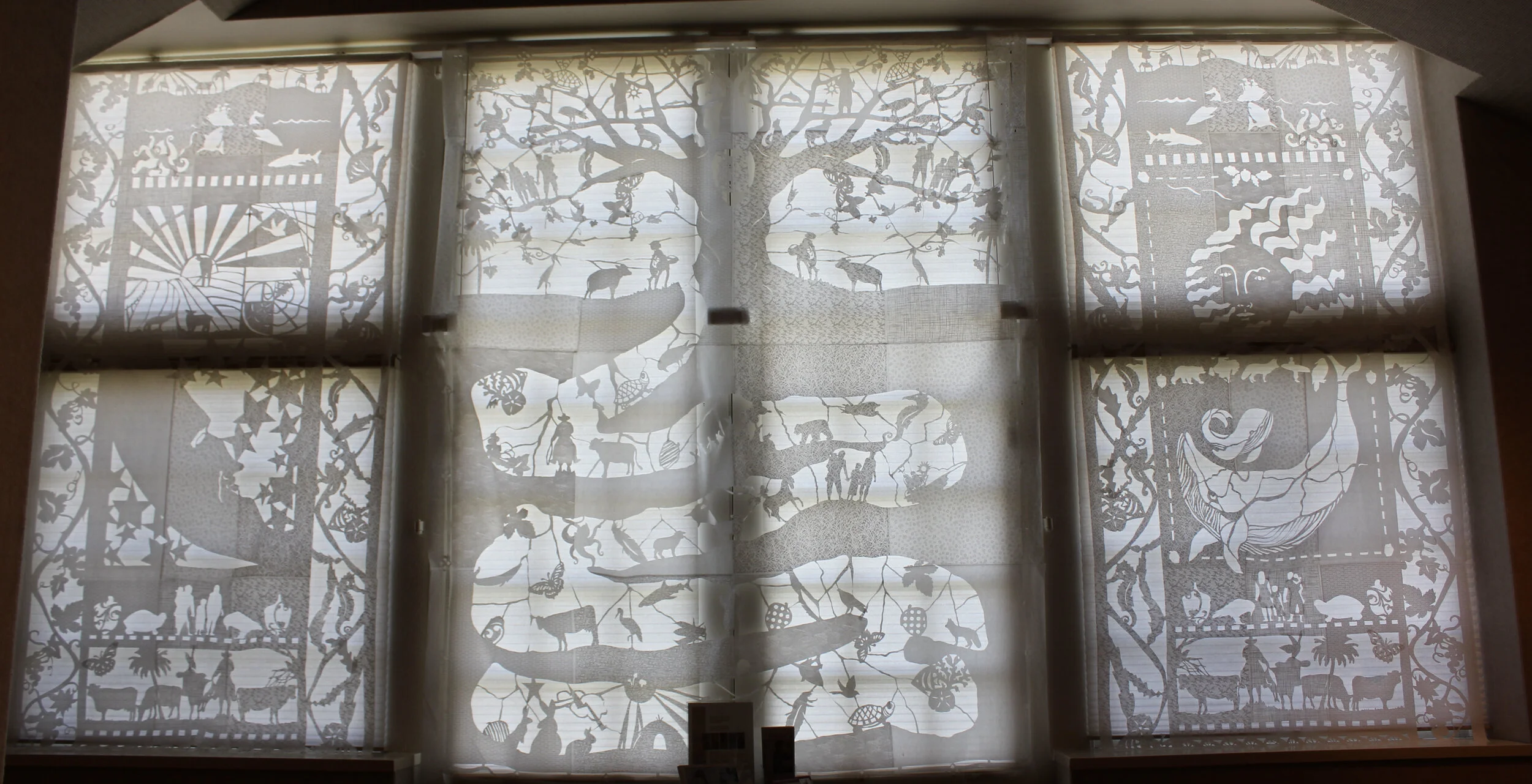 This 15 x 8 foot cut paper installation was designed for the Elverhoj Museum. This craft has roots the in the cutting practices of Danish Papirklip, Japanese Kirigami, and Mexican Papel Picado. The folk imagery identify the Central Coast region of California.